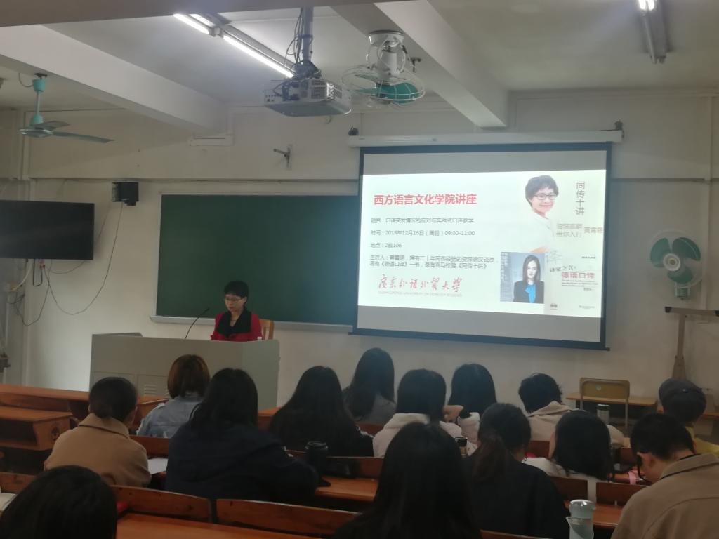 本网讯 2018年12月16日上午九点,德国驻沪总领事馆资深高翻黄霄翎在二教106教室为太阳成集团tyc122cc带来了一场关于口译突发情况应对及危机管理的讲座。黄霄翎女士从业20余年,是中国首位获得德国外交部德汉同传资格证的中国译员;著有口译专著《译家之言——德语口译》和《同传十讲:资深高翻黄霄翎带你入行》。讲座由德语系系主任卢铭君教授主持,太阳成集团tyc122cc德语系青年教师、多个语种的研究生和高年级本科生参加了讲座。