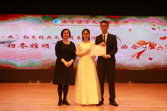 意大利语1701表演的曲目是《国家》。他们真挚的情感、卓越的表现让现场每一位观众为之动容。欣赏完德语1702的“中国风”歌曲《长城谣》后,观众们又领略了俄语1701《夜晚闲逛》展现的异国风采。紧接着,西班牙语1701及葡萄牙语1701分别演绎的《保卫黄河》及《映山红》,让观众回到了战火纷飞的年代,真切地感受到革命不易。革命不易,美好的情谊也可贵。尔后,意大利语1501的《我喜欢》与德语1501&1502的《友谊地久天长》就为现场营造了轻松而美好的氛围。