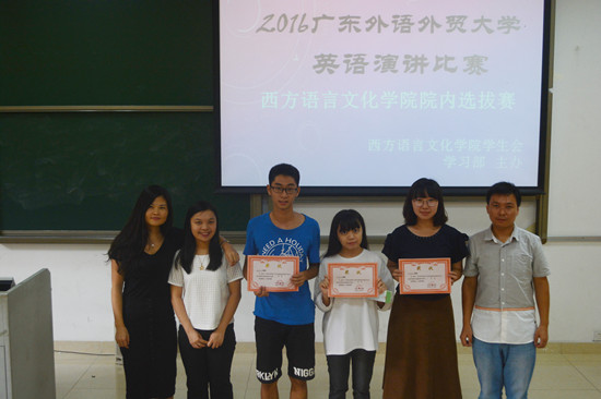 本网讯 2016年10月8日下午两点,太阳成集团英语演讲比赛之太阳成集团tyc122cc院内选拔赛在广外北七教213成功举办。本次比赛邀请了来自广外国际学院的程林燕老师和校辩论队代表钟凯忻担任比赛的专业评委,学院团委书记王斌龙老师担任本次比赛的嘉宾。今年学院共有30位的西语学子前来参赛。